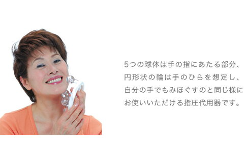 【商品詳細】●5つの球体は手の指にあたる部分、円形状の輪は手のひらを想定し、自分の手でもみほぐすのと同じ様にお使いいただける指圧代用器です。