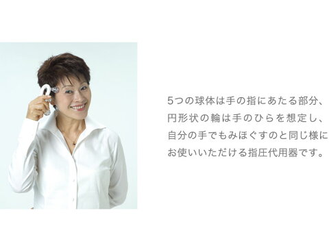 【商品詳細】●5つの球体は手の指にあたる部分、円形状の輪は手のひらを想定し、自分の手でもみほぐすのと同じ様にお使いいただける指圧代用器です。